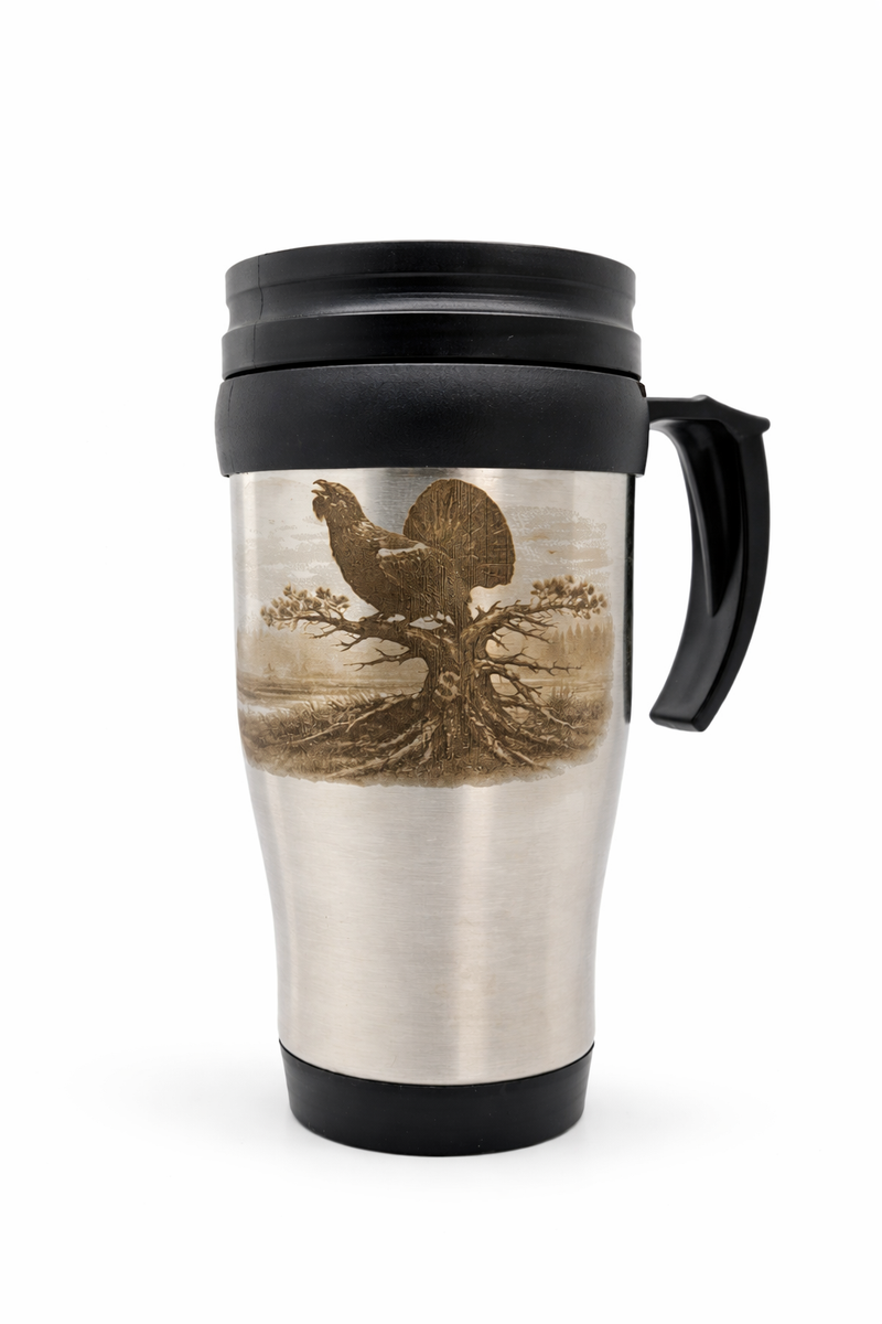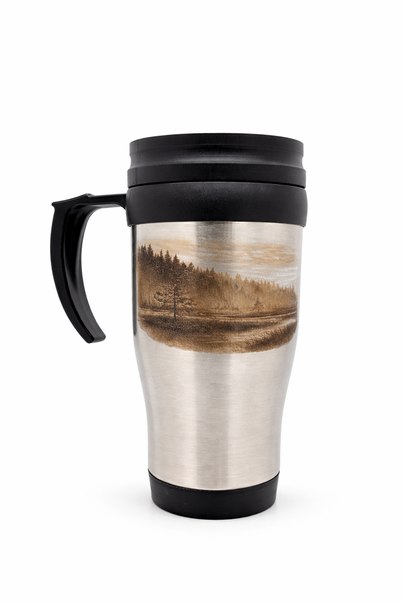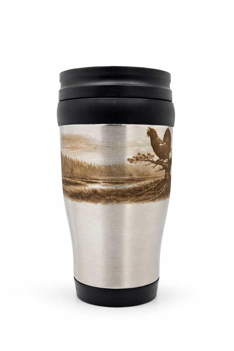 Ylväs ukkometso vanhan männyn latvassa, suomaiseman yllä. Tämä laserkaiverrettu termosmuki yhdistää suomalaisen luonnon tunnelman ja kestävän käytännöllisyyden. Kaiverrus tehdään suoraan mukin pintaan, joten kuvio ei kulu käytössä.